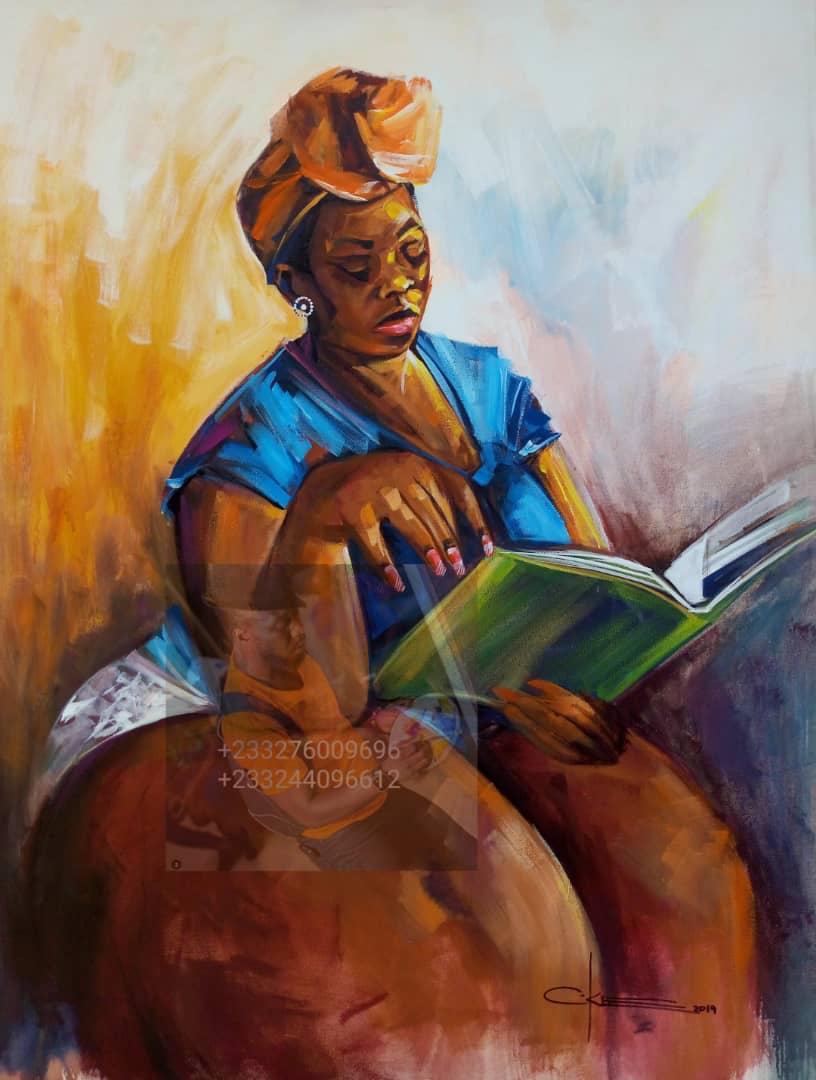 In our collection are the Tribal Mark series in which Sade Adebowale explore in paintings the different facial marks of the people of Nigeria, the Smile series in which Joshua Rotimi Adeyemi creates images of people of all ages smiling. He also created a thirteen pieces series for The Collection titled Common Man where he uses figurative images to show the manner in which majority of Nigerians make their living. Among the other series Joshua has created for The Collection are Dance originally inspired by my young friend, dancer Fana Tesfagiorgis and Let the Music Play On. Clement Laryea aka The Art Therapist series For The Love Books showing women, men and children reading is an interesting one.