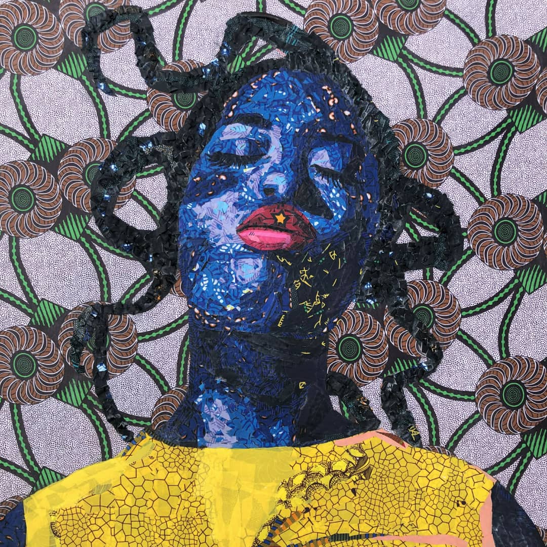 Gbonjubola Obatuyi: Dreaming, fabrics on canvas, 36 x 36 inches, 2020.
