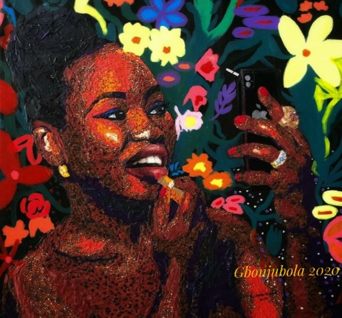 Gbonjubola Obatuyi: Self Love, fabrics on canvas, 36 x 36 inches, 2020.